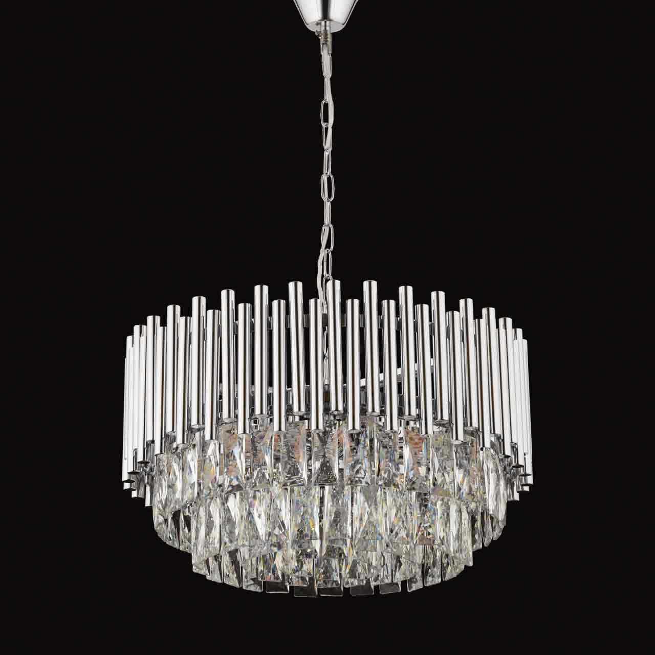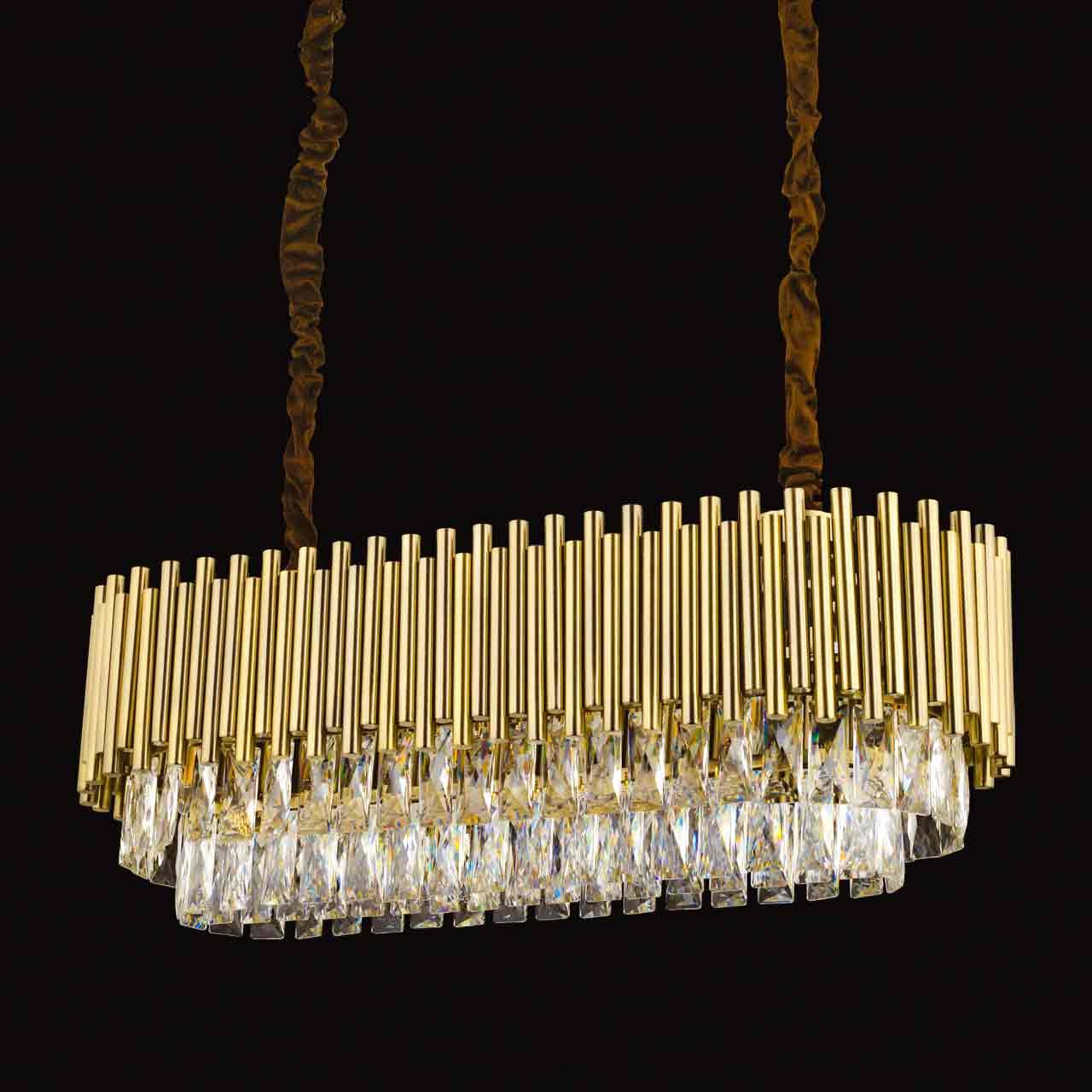 Borulu kristal avize. 50cm ve 60 cm çaplı yuvarlak model ile 85 cm uzunluğunda masa üstü modeli. Ek olarak gold, krom, bakır ve eskitme kaplama seçenekleri mevcuttur.