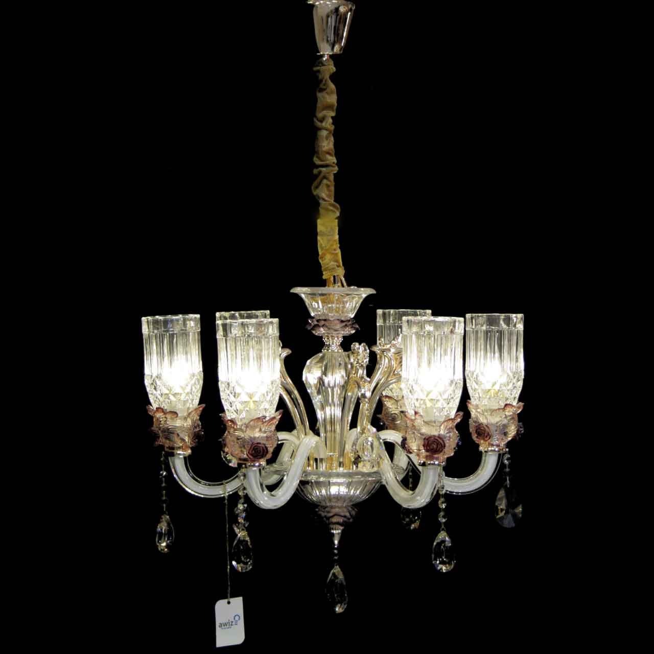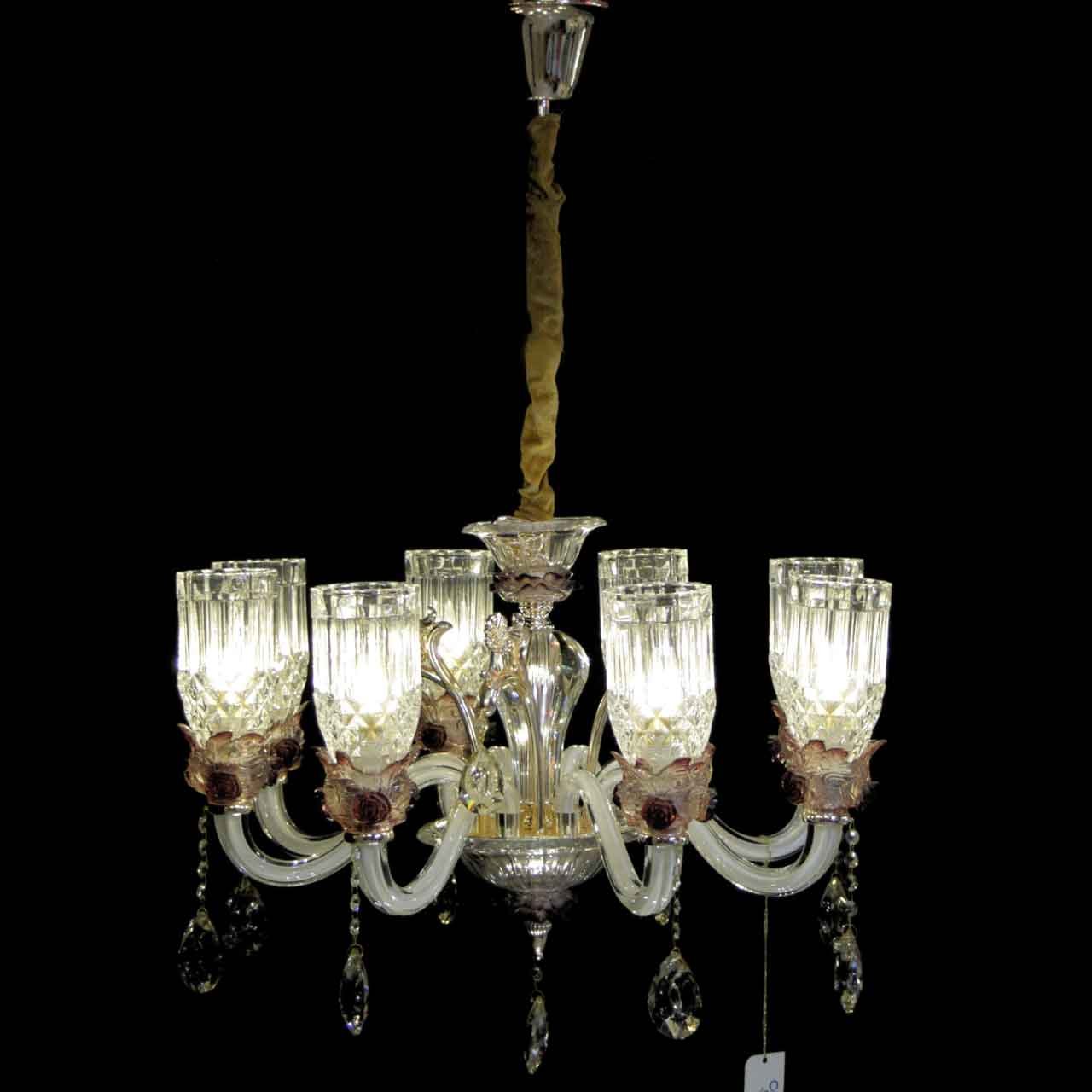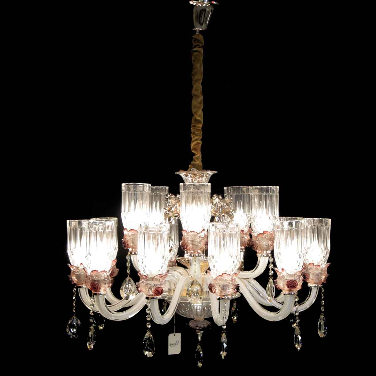 Kristal cam kollu, kesme kristal fanuslu, pembe kuvars detaylı avize. 6, 8 ve 12 kollu versiyonları mecuttur.